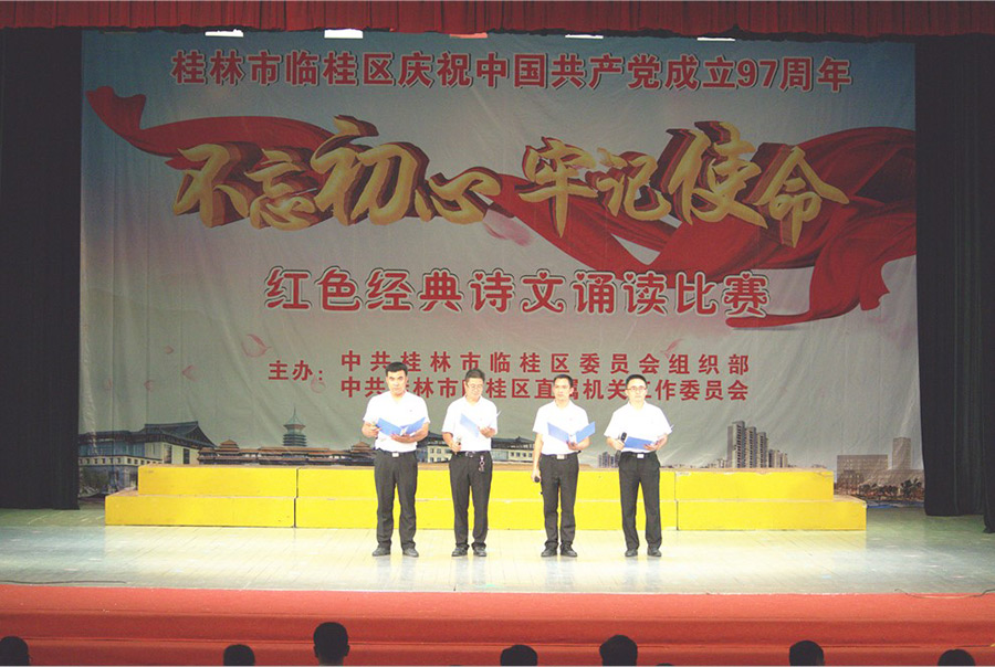 7月19日上午,陽光明媚。新城投資集團黨支部朱憲民、譚佳璐、周成、唐忠祥四名黨員在黨支部青年委員趙建斌的帶領下,前往臨桂影劇院參加臨桂區(qū)委組織部、臨桂區(qū)直機關工委舉辦的“不忘初心·牢記使命”紅色經(jīng)典詩文誦讀比賽活動。