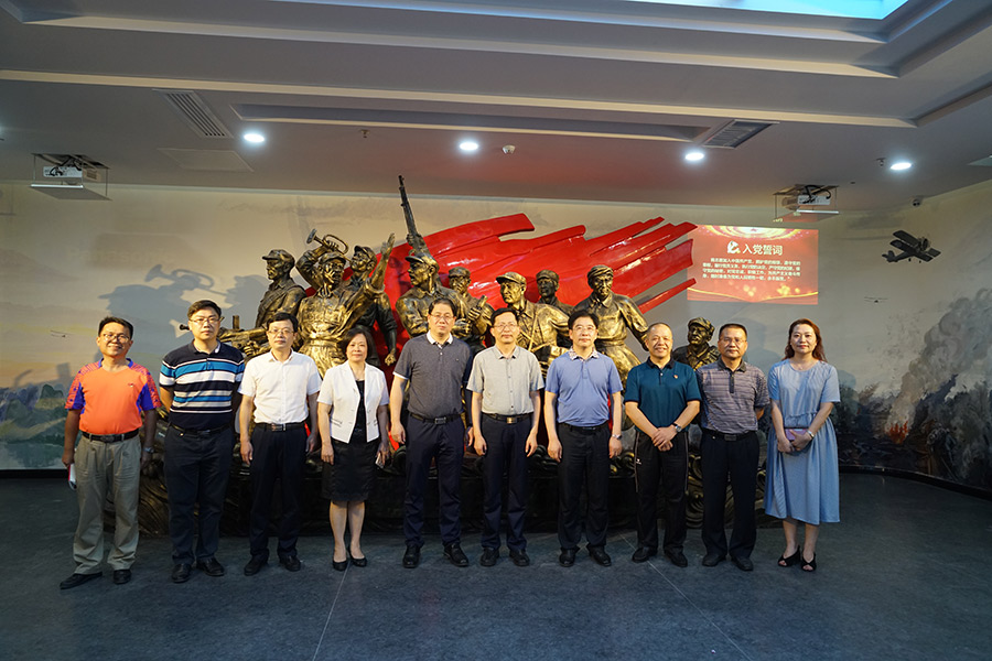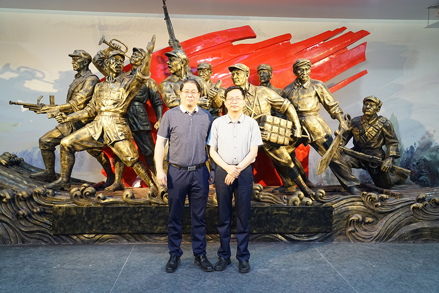 呂洪安、彭東光一行在湘江戰(zhàn)役雕塑前合影