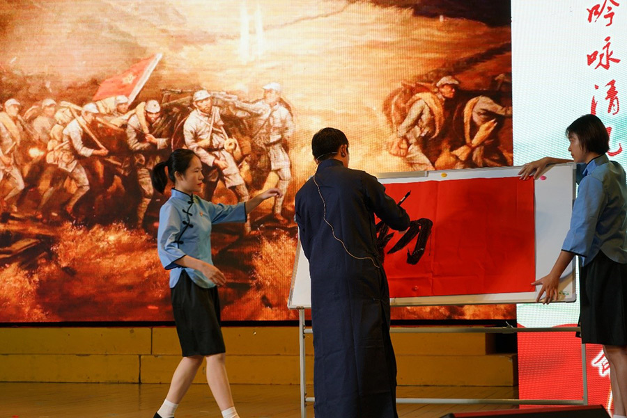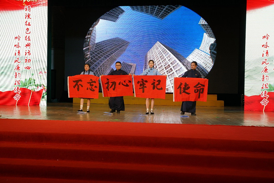 新城投資集團黨支部四名黨員朗誦的詩歌《不忘初心,牢記使命,我們永遠在路上》,節(jié)目形式新穎,選手語言真摯,富有感染力地回顧黨的光輝歷程,謳歌黨的豐功偉績和改革開放40年來取得的偉大成就,或深情款款、或激情高昂的精彩誦讀引起了在場觀眾的心靈共鳴,掌聲不斷。黨員譚佳璐在現(xiàn)場用毛筆書寫了“不忘初心,牢記使命”八個大字,表達了黨員們樹立遠大的理想、力爭上游、為祖國的強盛貢獻力量的決心。