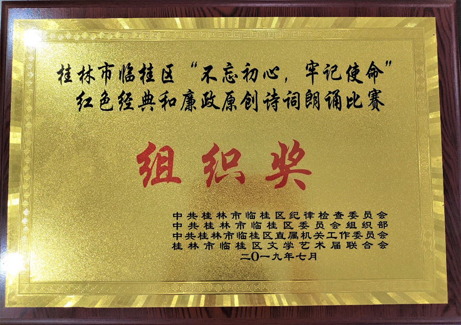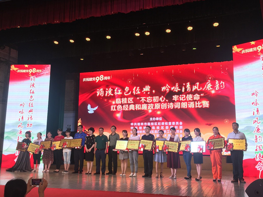 為熱烈慶祝中國共產(chǎn)黨成立98周年,向建國70周年獻禮,7月25日上午,新城投資集團黨支部朱憲民、譚佳璐、唐文娟、梁雯棋四名黨員代表參加了臨桂區(qū)紀委監(jiān)委、區(qū)委組織部、區(qū)直屬機關工委、區(qū)文學藝術界聯(lián)合會舉辦的“不忘初心?牢記使命”主題教育紅色經(jīng)典和廉政詩詞朗誦比賽活動。