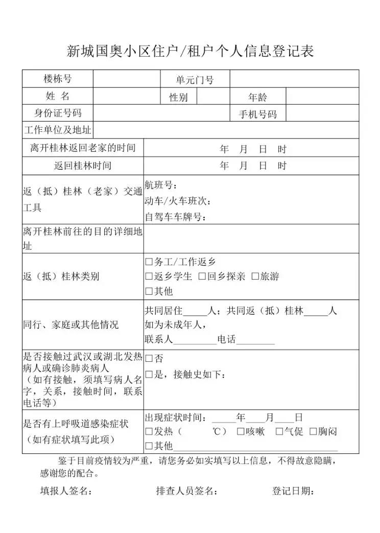 您好!根據臨桂區(qū)疫情防控指揮部及新區(qū)管委會的要求,為切實做好疫情防控工作,杜絕在本小區(qū)內發(fā)現疫情隱患,我們將對小區(qū)內所有的住戶進行逐一排查,請您配合我們填寫《新城國奧小區(qū)住戶/租戶個人信息登記表》。