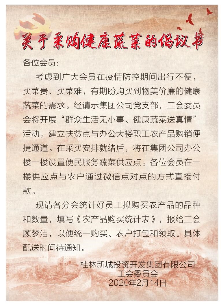 “你搶著菜了嗎?”已經(jīng)成為新冠肺炎疫情下,除“你搶著口罩了嗎?”外另一句流行的打招呼方式。而居家隔離、不敢出門、菜市場(chǎng)貨物短缺出現(xiàn)的買菜貴、買菜難等等問題隨之而來。集團(tuán)公司工會(huì)想職工之所想,始終關(guān)心職工冷暖,把“新鮮蔬菜配送到辦公樓”的想法模式孕育而生。在集團(tuán)黨支部的指導(dǎo)下,工會(huì)委員會(huì)主動(dòng)聯(lián)系周邊鄉(xiāng)鎮(zhèn)的貧困農(nóng)戶,組織開展“群眾生活無小事、健康蔬菜送真情”點(diǎn)對(duì)點(diǎn)活動(dòng),即開通扶貧點(diǎn)農(nóng)戶的農(nóng)產(chǎn)品與辦公大樓職工的購(gòu)銷便捷通道,這種做法不僅充分發(fā)揮了工會(huì)聯(lián)系群眾的橋梁紐帶作用,把密切聯(lián)系群眾的優(yōu)勢(shì)轉(zhuǎn)化為疫情防控的優(yōu)勢(shì),而且還搭建起了一座防疫與扶貧的愛心橋,將“群眾利益無小事,一枝一葉總關(guān)情”的工會(huì)服務(wù)理念落在了實(shí)處。