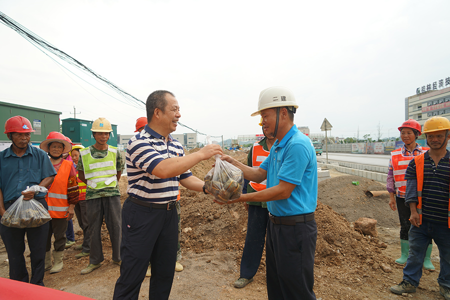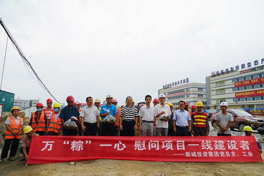 上午,新城投資集團(tuán)黨總支、工會(huì)還開展了“萬'粽'一心,共創(chuàng)文明城”端午節(jié)慰問項(xiàng)目一線建設(shè)者活動(dòng),臨桂新區(qū)工委委員、管委會(huì)副主任文杰,集團(tuán)黨總支書記、董事長(zhǎng)周道林率隊(duì)帶著新鮮出爐的粽子,來到西城大道南延長(zhǎng)線兩個(gè)標(biāo)段施工現(xiàn)場(chǎng),為奮斗在市政府限期完工的西城大道南延長(zhǎng)線,慰問一線的190名建設(shè)者們。