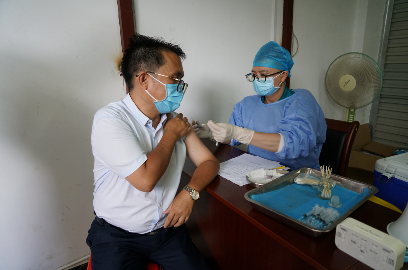 第二針接種流程與第一針相同,現場分為登記區(qū)、錄入區(qū)、接種區(qū)、留觀區(qū)和緊急處置區(qū)。集團黨總支書記周道林,副總經理吳濤,工會主席譚力源等到現場了解接種現場安排情況并帶頭接種新冠疫苗第二針。