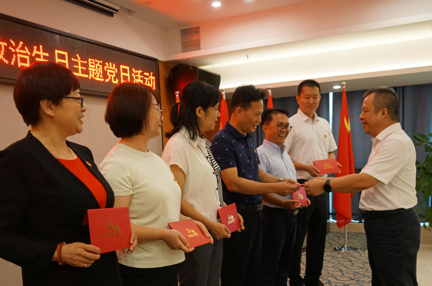 大會(huì)直播結(jié)束后,集團(tuán)黨總支開(kāi)展“獻(xiàn)禮建黨百年 政治生日憶初心”主題黨日活動(dòng),為所有的黨員慶祝政治生日。自治區(qū)優(yōu)秀黨務(wù)工作者、黨總支書(shū)記、董事長(zhǎng)、總經(jīng)理周道林向黨總支委員和支部委員贈(zèng)送政治生日卡,第一支部、第二支部書(shū)記向其他黨員贈(zèng)送政治生日卡?!斑@是一份沉甸甸的政治生日禮物,是初心,更是責(zé)任”“我會(huì)時(shí)刻牢記共產(chǎn)黨員這一特殊身份”。黨員們?cè)谑盏秸紊湛〞r(shí),更多的感受到的是黨員的身份、黨員的榮譽(yù)、黨員的宗旨。