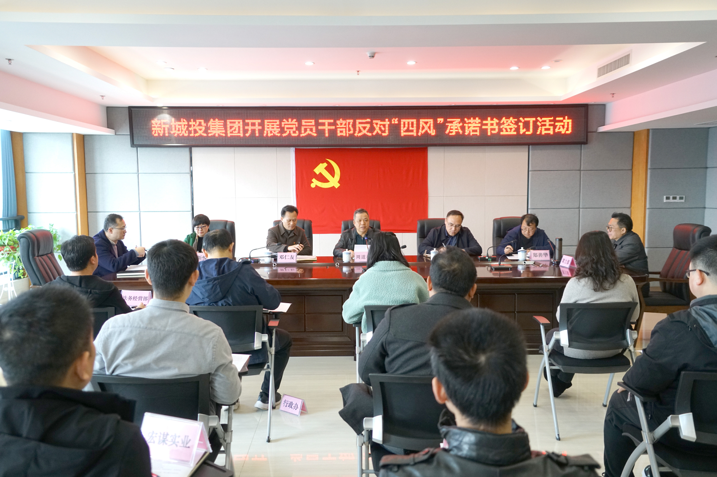 為進(jìn)一步深入貫徹習(xí)近平總書(shū)記關(guān)于進(jìn)一步糾治“四風(fēng)”、加強(qiáng)作風(fēng)建設(shè)的論述,深入開(kāi)展黨員干部涉酒違紀(jì)違法問(wèn)題專(zhuān)項(xiàng)整治工作,近日,新城投集團(tuán)組織公司班子成員,各部室、子公司負(fù)責(zé)人等黨員干部簽訂《黨員干部和公職人員反對(duì)“四風(fēng)”承諾書(shū)》,公開(kāi)承諾帶頭自覺(jué)糾正“四風(fēng)”,持之以恒貫徹落實(shí)中央八項(xiàng)規(guī)定及其實(shí)施細(xì)則精神,主動(dòng)接受監(jiān)督。集團(tuán)黨總支書(shū)記、董事長(zhǎng)周道林主持會(huì)議。集團(tuán)領(lǐng)導(dǎo)班子成員,各部室、子公司負(fù)責(zé)人參加會(huì)議。