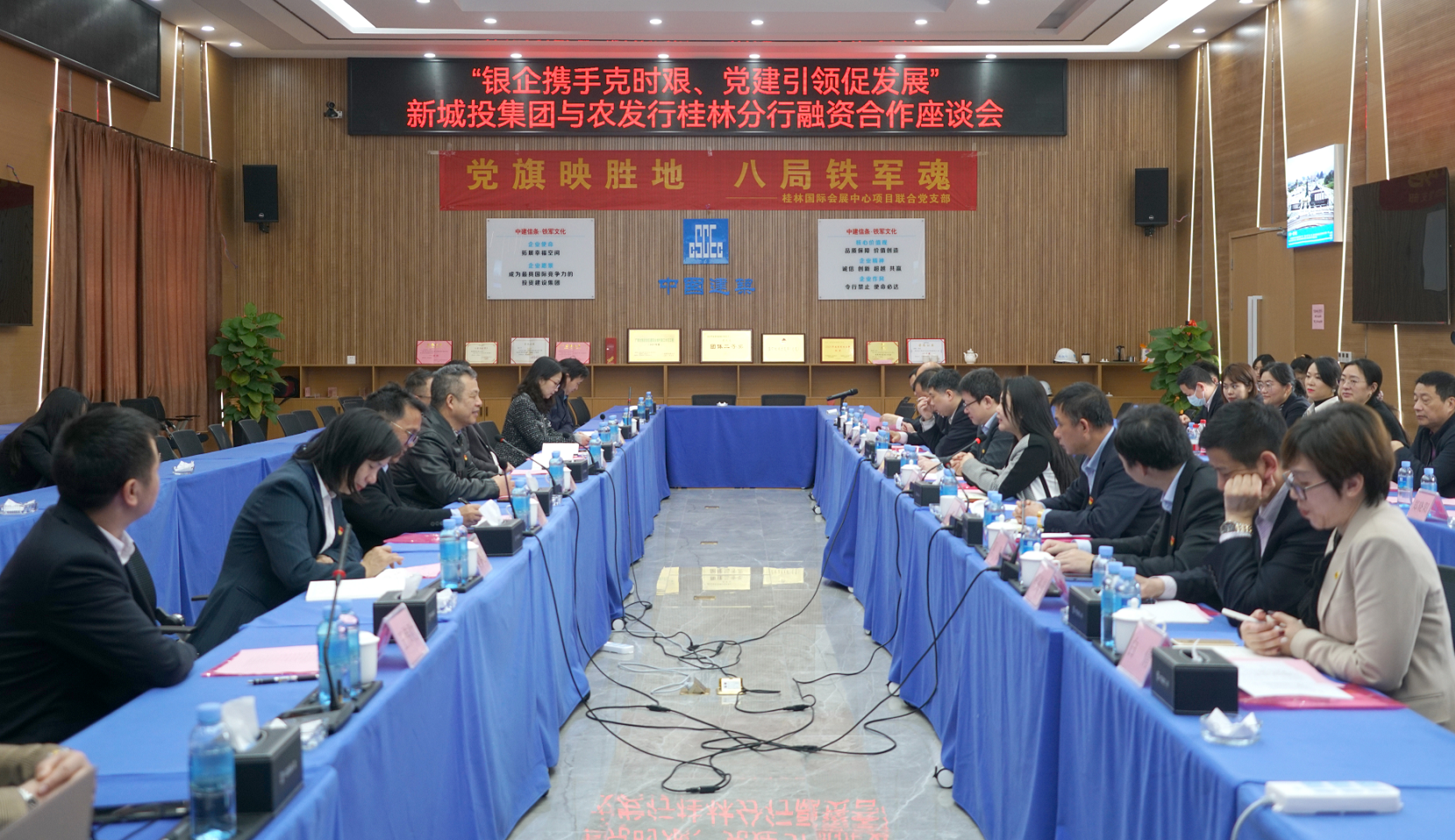 隨后,在會展中心項目部會議室召開融資合作座談會。雙方分別就發(fā)展理念、職能定位、黨建工作和業(yè)務領域進行了探討。