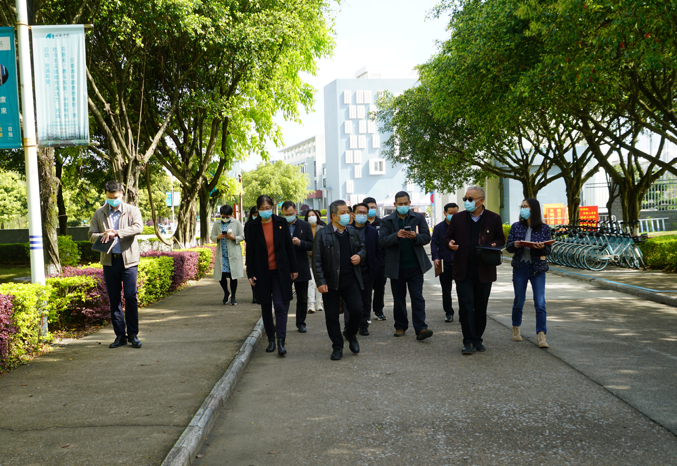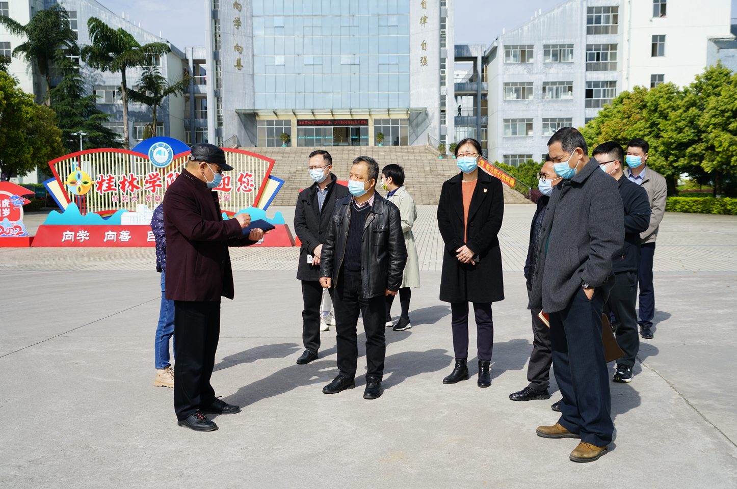 在學(xué)校門口,檢查組重點檢查了師生進出校門體溫、健康碼、行程碼核驗情況,查看了學(xué)生離校批條,詳細了解了學(xué)校疫情報告制度、措施等情況。檢查組指出,要嚴格把好入?!瓣P(guān)口”,關(guān)閉其他進出通道,師生員工進出必須核驗身份、查驗體溫、“亮”碼通行,校外無關(guān)人員一律不準(zhǔn)入校。檢查組隨后對各類防疫物資儲備及管控情況進行了檢查,確保防疫物資安全有效,對衛(wèi)生所、隔離觀察區(qū)、建設(shè)工地等重點區(qū)域疫情防控工作進行檢查,對學(xué)校師生員工的生活情況、即將到來的“廣西三月三和清明”雙節(jié)的學(xué)生放假情況進行了解,對安全保衛(wèi)、學(xué)生管理等問題與相關(guān)負責(zé)人、管理人員進行座談交流。會上針對嚴格貫徹落實《桂林市開展黨員干部和公職人員涉酒違紀違法問題專項整治工作方案》的要求,對酒后滋事、酒駕等違紀違法行為加大問責(zé)力度,并對“廣西三月三和清明”廉潔過節(jié)提出了紀律要求。