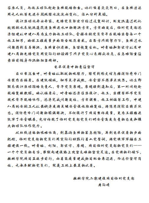 本次征文比賽不僅挖掘了一批真實動人的黨員故事,更成為支部黨員學習先進、對標榜樣、凝聚共識的重要載體。通過“講身邊事、學身邊人”,黨員們進一步深化了對黨的二十大精神的理解,激發(fā)了立足崗位、爭先創(chuàng)優(yōu)的熱情。獲獎作品《黨旗映勝地,奉獻筑華章》《清風拂過案頭》《黨旗作帆破浪行——桂林學院工地的紅色堡壘》等,以細膩筆觸描繪了黨員在不同領(lǐng)域的堅守與奉獻,成為支部內(nèi)互學互鑒的鮮活教材。