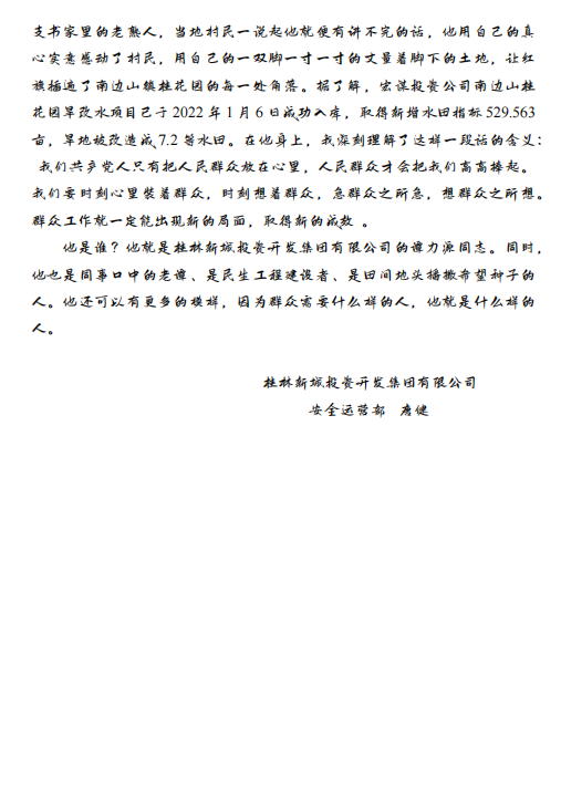 新城投集團第三黨支部近日成功舉辦了“講好我身邊的黨員故事”主題征文比賽,活動以弘揚黨員先鋒模范作用、展現(xiàn)基層黨員奉獻精神為宗旨,通過講述身邊黨員的感人事跡,進一步凝聚支部向心力,推動黨的二十大精神落地生根。本次活動取得了顯著成效,為集團黨建工作注入新活力。