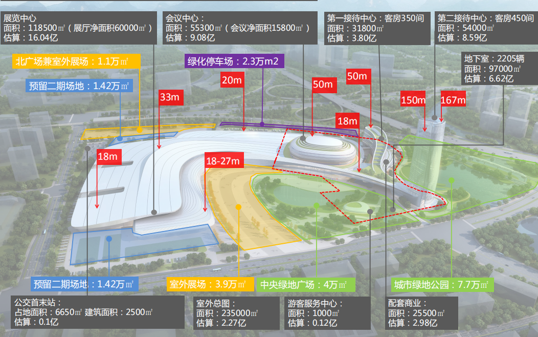 新城投資集團全資子公司宏謀會展公司注冊資本6億元,重點服務(wù)會展中心項目建設(shè)。會展中心估算一期總投資約633438.61萬元,其中一期總投資約 44.5億元,建設(shè)工期從2020年9月至2023年3月。項目建設(shè)規(guī)劃選址在臨桂新區(qū)洋田路以北、三元路以西、機場路以東地塊。項目總建筑面積400920.93平方米,其中一期總建筑面積310400.76平方米。