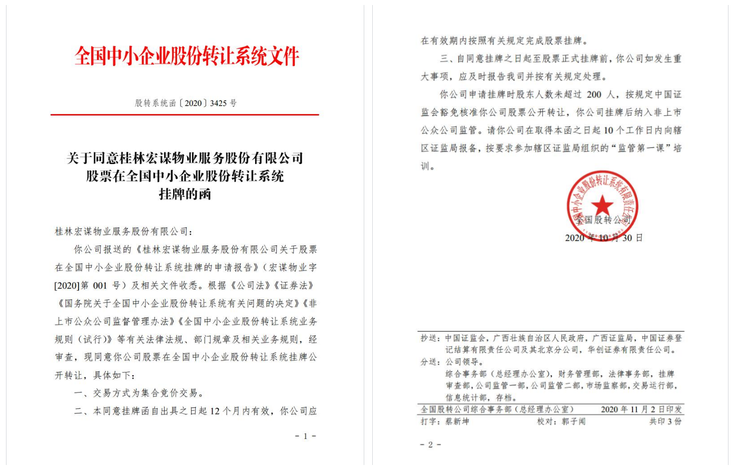2020年12月9日下午,桂林新城投資開發(fā)集團有限公司下屬子公司桂林宏謀物業(yè)服務股份有限公司在全國中小企業(yè)股份轉讓系統即新三板上市。桂林宏謀物業(yè)服務股份有限公司(股票簡稱:宏謀物業(yè);股票代碼:873532)成為桂林市第一家在新三板上市的國企物業(yè)公司。