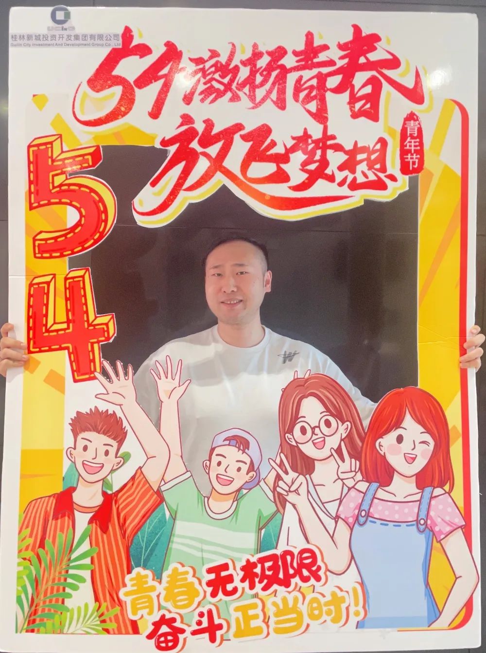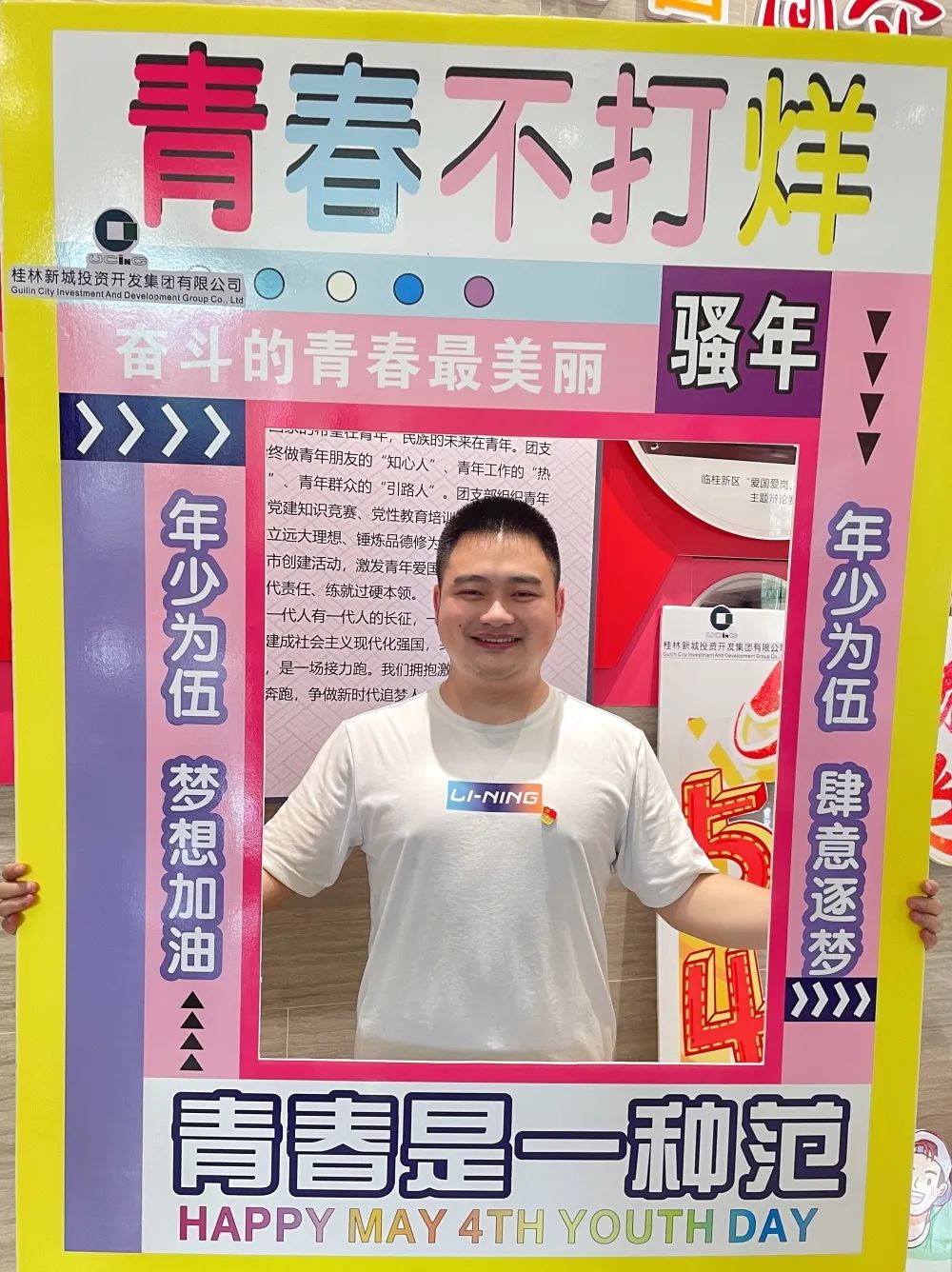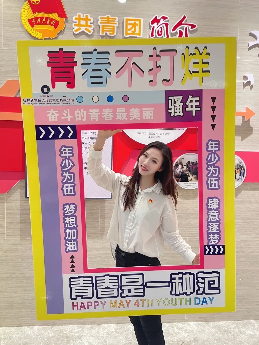 公司一樓大廳,團(tuán)支部布置了“五四主題”畫框打卡活動,熱烈慶祝五四青年節(jié)到來。周道林帶頭打卡,并鼓勵全體員工積極參與拍照打卡活動,渲染喜慶的節(jié)日氛圍。