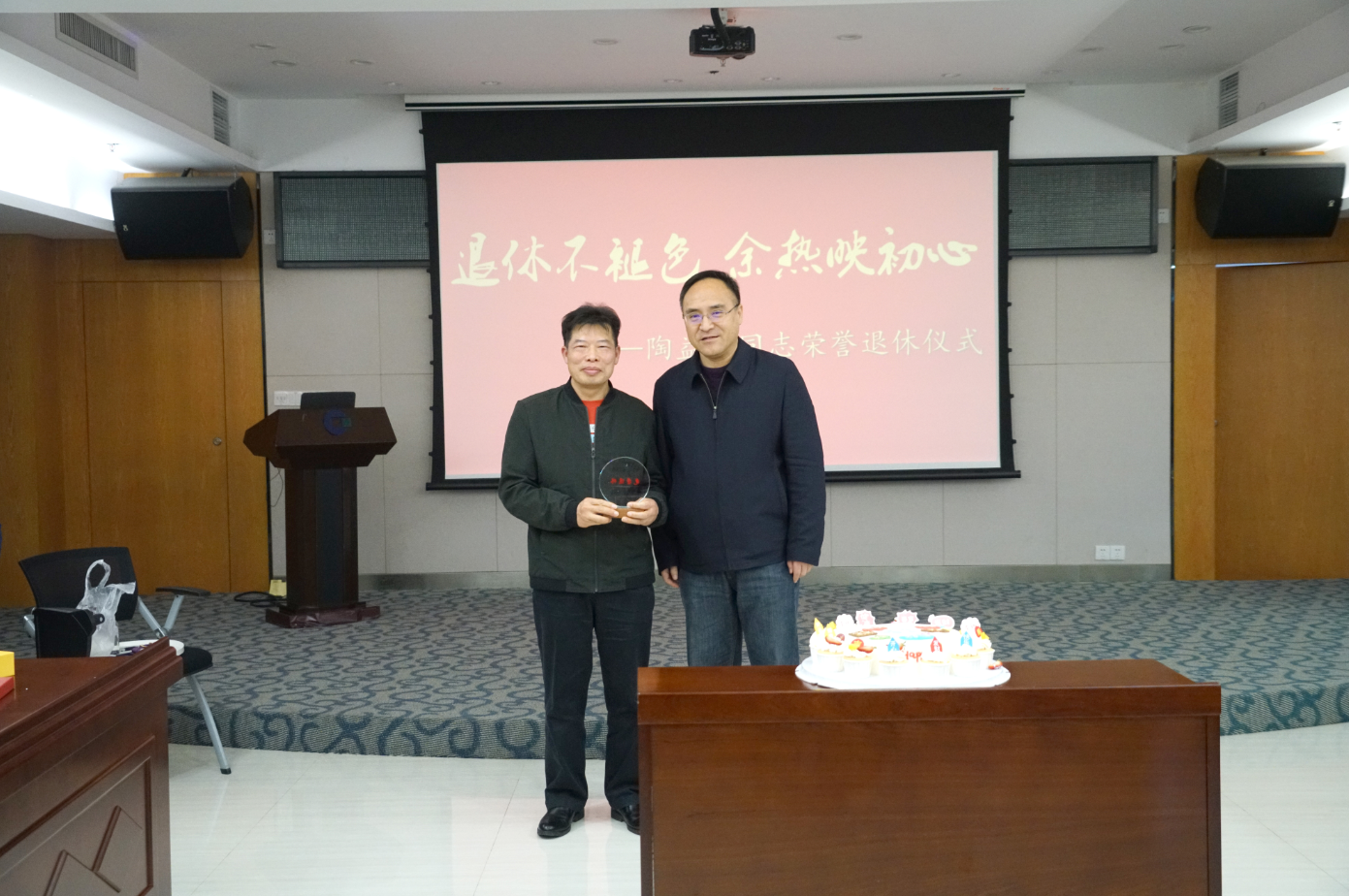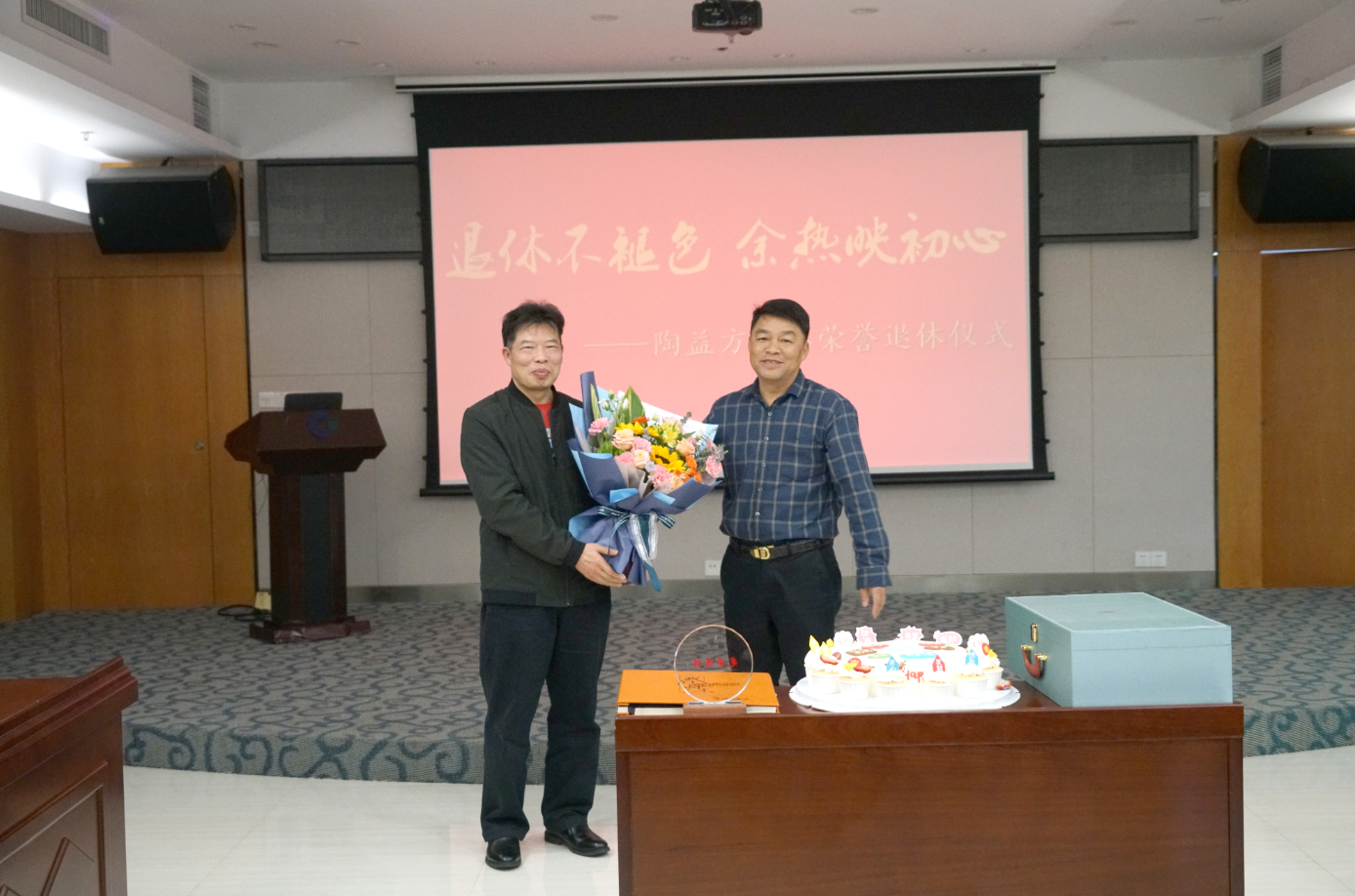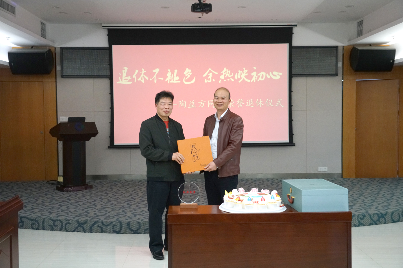 集團(tuán)黨委副書(shū)記兼紀(jì)委書(shū)記、監(jiān)事會(huì)主席、工會(huì)主席譚力源向陶益方贈(zèng)送退休禮物