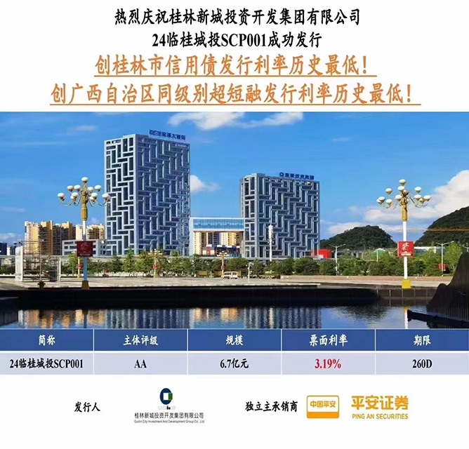 1月9日,桂林城鄉(xiāng)建設(shè)控股集團(tuán)旗下桂林新城投資開發(fā)集團(tuán)有限公司成功發(fā)行2024年度第一期超短融,規(guī)模6.7億元,期限260天,票面利率3.19%,認(rèn)購倍數(shù)5.08倍,本期超短融由平安證券獨(dú)立承銷。此次成功發(fā)行超短融創(chuàng)下桂林市有史以來信用債發(fā)行的最低利率,也是有史以來廣西壯族自治區(qū)同級別超短融發(fā)行利率最低!在市委市政府、市金融辦、市國資委、城建集團(tuán)的指導(dǎo)幫助下,新城投集團(tuán)認(rèn)真落實(shí)各項(xiàng)決策部署,結(jié)合自身實(shí)際,爭分奪秒抓發(fā)展,多措并舉促融資。