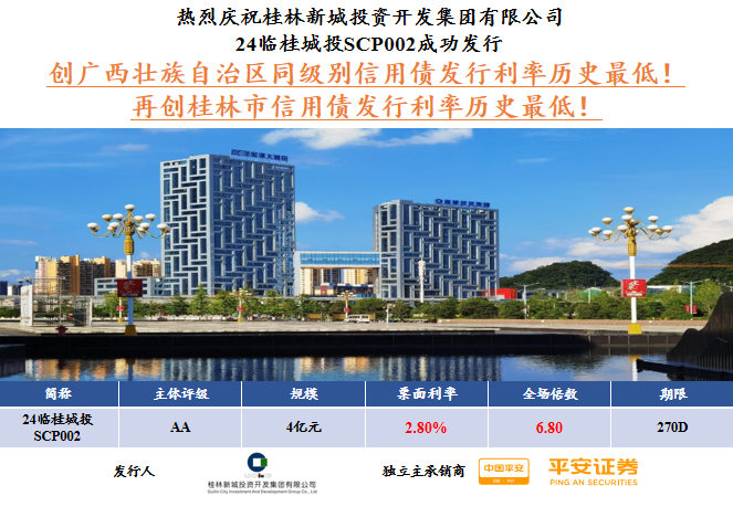 2月2日,桂林城鄉(xiāng)建設控股集團有限公司旗下桂林新城投資開發(fā)集團有限公司成功發(fā)行2024年度第二期超短融,規(guī)模4億元,期限270天,票面利率2.80%,認購倍數(shù)6.80倍,本期超短融由平安證券獨立承銷。此次成功發(fā)行超短融再創(chuàng)桂林市信用債發(fā)行利率歷史最低,也是廣西壯族自治區(qū)同級別超短融發(fā)行利率歷史最低!