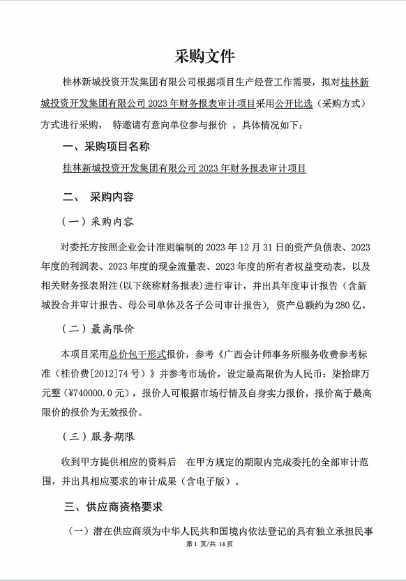 桂林新城投資開(kāi)發(fā)集團(tuán)有限公司2023年財(cái)務(wù)報(bào)表審計(jì)項(xiàng)目采購(gòu)文件